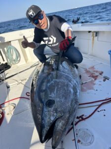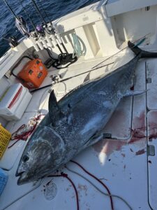今日はプライベートで 解禁したクロマグロ狙い 2ヒット1キャッチ 225㌢、210㌔ 1人では上げられず 3人がかりで何とか上がりました。